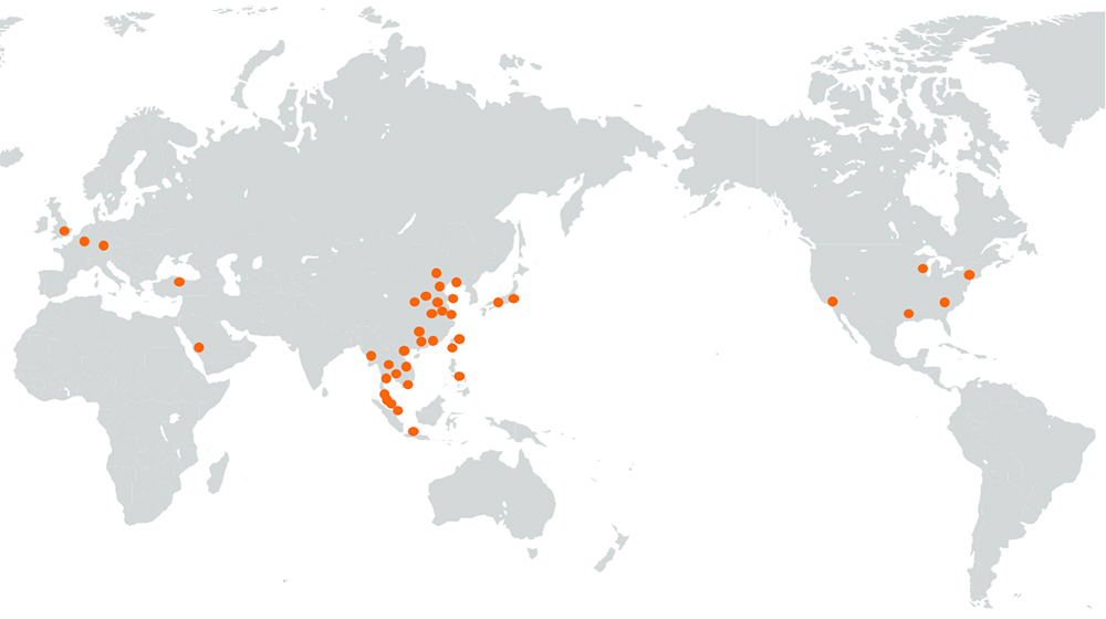Hiện nay, chúng tôi sở hữu hơn 20 công ty con tại nước ngoài ở các khu vực như Bắc Mỹ, Châu Âu, Châu Á, v.v., với hoạt động kinh doanh trải dài trên hơn 270 địa điểm toàn cầu (bao gồm cả Nhật Bản). Thông qua mạng lưới toàn cầu này, chúng tôi không ngừng tăng cường và mở rộng năng lực logistics quốc tế.